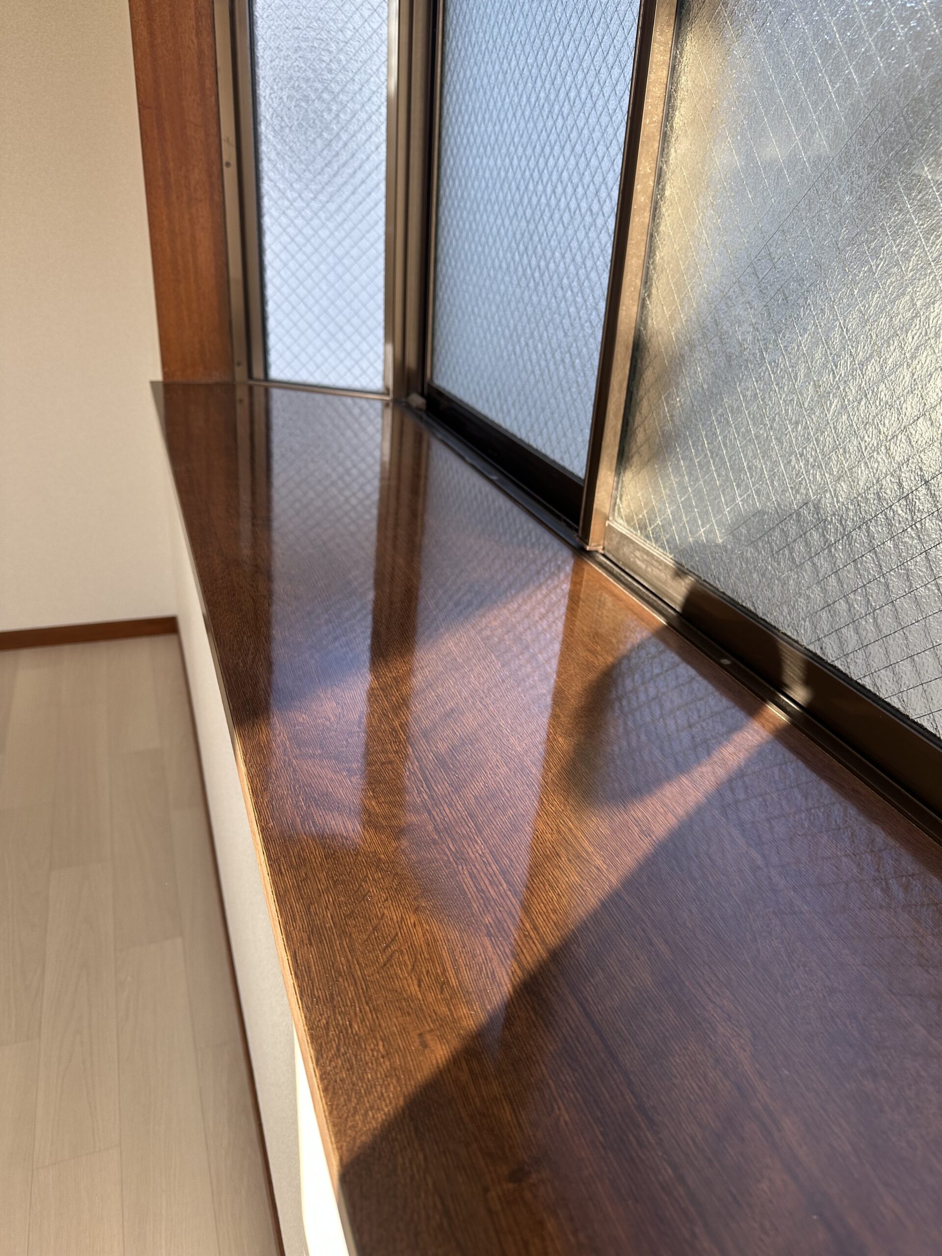 窓際のカウンターにできる“白く濁ったシミ”って、気づいたら広がっていて結構気になるんですよね。今回はその白濁を丁寧に研磨し、クリア仕上げでスッと透明感を取り戻しました。交換までは必要ないけれど、見た目をきれいにしたい方には、この部分リペアが一番おすすめ。メラミンが蘇ると、お部屋の印象もグッと良くなりますね。鏡面の復活!