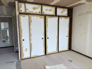 工夫すれば、昔ながらの襖もこんなふうにおしゃれな建具として使うことができます。既存の古っちゃげた襖を活かしながら、お部屋の印象を変えるのも内装リフォームの面白いところですね。なかなか楽しい試みでした(^^♪