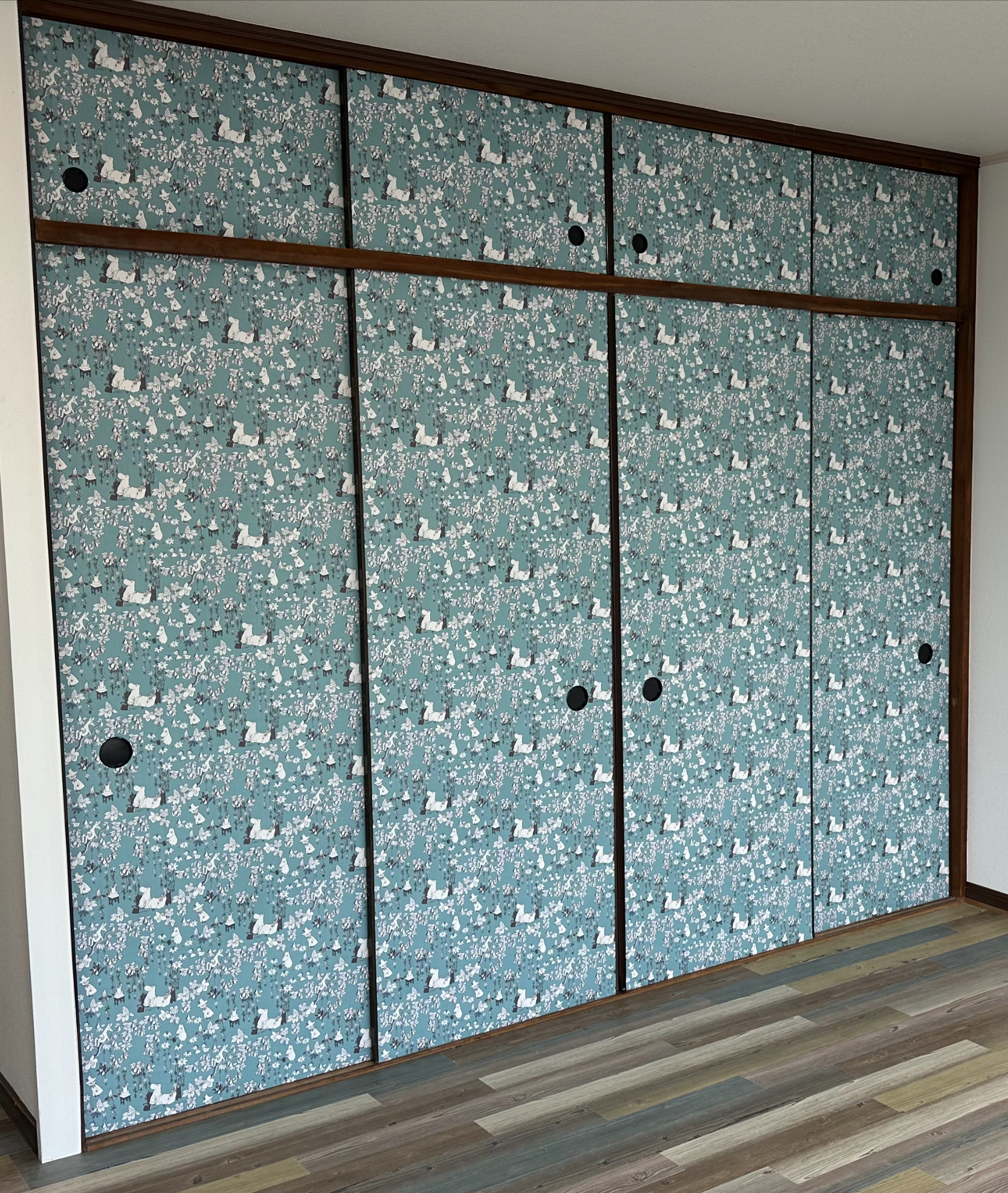 今回は襖紙ではなくクロス仕上げにすることで、和室だけでなく洋室にも合う雰囲気に変身です。ムーミン柄が何ともファンタジックで可愛かったりします。
