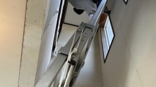吹き抜け壁のクロス張替え事例。2連梯子を使った高所作業の安全対策から、剥がし・パテ処理・下地確認まで職人目線で解説します。
